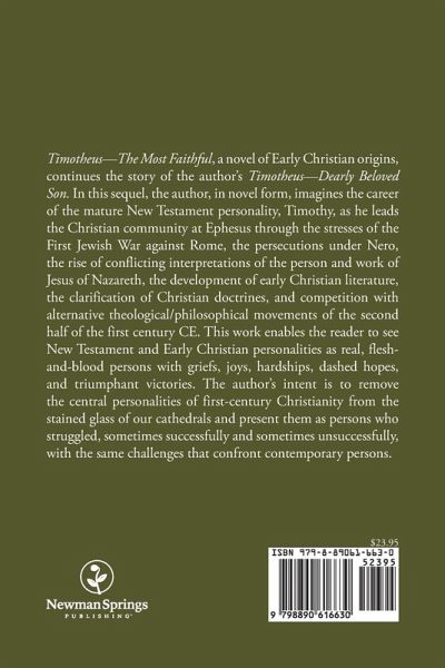 Timotheus--The Most Faithful, a novel of Early Christian origins, continues the story of the author's Timotheus--Dearly Beloved Son. In this sequel, the author, in novel form, imagines the career of the mature New Testament personality, Timothy, as he leads the Christian community at Ephesus through the stresses of the First Jewish War against Rome, the persecutions under Nero, the rise of conflicting interpretations of the person and work of Jesus of Nazareth, the development of early Christian literature, the clarification of Christian doctrines, and competition with alternative theological/philosophical movements of the second half of the first century CE. This work enables the reader to see New Testament and Early Christian personalities as real, flesh-and-blood persons with griefs, joys, hardships, dashed hopes, and triumphant victories. The author's intent is to remove the central personalities of first-century Christianity from the stained glass of our cathedrals and present them as persons who struggled, sometimes successfully and sometimes unsuccessfully, with the same challenges that confront contemporary persons.