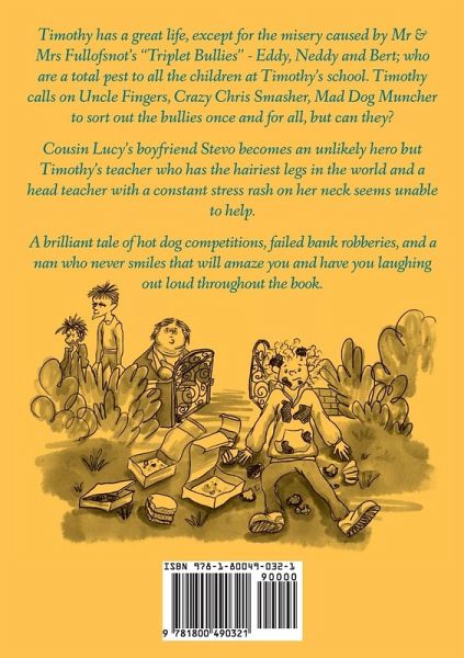 Timothy has a great life, except for the misery caused by Mr & Mrs Fullofsnot's "Triplet Bullies" - Eddy, Neddy and Bert; who are a total pest to all the children at Timothy's school. Timothy calls on Uncle Fingers, Crazy Chris Smasher, Mad Dog Muncher to sort out the bullies once and for all, but can they? Cousin Lucy's boyfriend Stevo becomes an unlikely hero but Timothy's teacher who has the hairiest legs in the world and a head teacher with a constant stress rash on her neck seems unable to help. A brilliant tale of hot dog competitions, failed bank robberies, and a nan who never smiles that will amaze you and have you laughing out loud throughout the book.