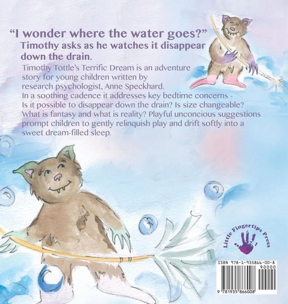 "I wonder where the water goes?" Timothy asks as he watches it disappear down the drain. After being tucked into bed by his mother, Timothy drifts into a dream filled sleep in which he returns to the bathtub-where he change sizes and rides his toy sailboat right down the drain! There he meets the bathtub water cleaning monsters who take him on a frantic frolic. Timothy and the monsters jump on all the beds in their bedtime party until they finally collapse into sleep! One of the monsters dreams of taking a sailboat to Timothy's home to be kissed and tucked in sweetly by Timothy's mother. Meanwhile Timothy sails back home to sleep in his own little bed-until morning when he runs to his mother's bed to tell her all about his terrific dream!" Written by research psychologist Anne Speckhard, Timothy Tottle's Terrific Dream addresses key bedtime concerns of young children in a soothing cadence. Playful suggestions prompt children to gently relinquish play and drift slowly into a sweet dream-filled sleep. Touching illustrations by New York city's emerging artist, Jessica Speckhard show the love between mother and child, the playfulness of dreams and provide the security to let go and drift into sleep... Timothy Tottle's Terrific Dream is the first in the series of Timothy Tottle's Amazing Adventures, published by Little Fingertips Press, an imprint of Advances Press, LLC.