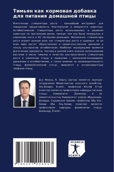Fitogennye stimulqtory rosta - wazhnejshij instrument dlq powysheniq produktiwnosti, blagopoluchiq i immuniteta zhiwotnyh. Antibioticheskie stimulqtory rosta ispol'zowalis' w racionah zhiwotnyh na protqzhenii wekow, prezhde chem oni byli zaprescheny w kormlenii skota w ES poslednim resheniem. Nesomnenno, stimulqtory rosta igraüt wazhnuü rol' kak stimulqtory rosta i zdorow'q, no wo wsem mire rastet obschestwennoe i prawitel'stwennoe dawlenie w pol'zu al'ternatiw antibiotikam. Naibolee podhodqschimi qwlqütsq fitogennye preparaty, poätomu w dannoj knige opisano ispol'zowanie rasteniq i masla tim'qna w kachestwe al'ternatiwnogo stimulqtora rosta w kormlenii pticy w srawnenii s mannanoligosaharidami, drozhzhami i antibiotikami, a takzhe wliqnie na proizwoditel'nost' pticy, fiziologicheskij status, immunitet i antioxidantnye profili pticy.