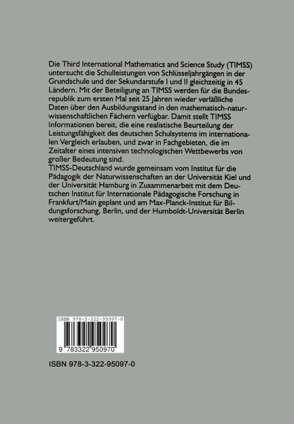 Zusammenfassung.- A. Einleitung.- 1. Was ist TIMSS?.- 2. Die Forschungsgruppen.- 3. Finanzierung.- 4. Wissenschaftliche Mitarbeiter in Deutschland.- 5. Danksagung.- 6. Gegenstand und Aufbau des Berichts.- B. Anlage und Durchführung von TIMSS.- Zentrale Gesichtspunkte im Überblick.- 1. Verbund von Teilstudien mit unterschiedlichen methodischen Vorgehensweisen.- 2. Untersuchung von drei Altersgruppen.- 3. Internationale Querschnitt- und nationale Längsschnittstudie.- 4. Rahmenkonzeption.- 5. Test- und Fragebogenentwicklung für Population 2.- 6. Stichprobenziehung für Population 2.- 7. Durchführung der Untersuchung.- 8. Datenaufbereitung und Qualitätskontrollen.- 9. Videotape Classroom Study (TIMSS-Video).- C. Fachleistungen in den mathematisch-naturwissenschaftlichen Fächern.- Zentrale Ergebnisse im Überblick.- 1. Anliegen und Grenzen der deskriptiven Darstellung der TIMSS-Leistungsergebnisse.- 2. Vorstellung der Fachleistungstests: Technische Grundlagen.- 3. Inhaltliche Bereiche der Fachleistungstests.- 4. Stufen mathematischer und naturwissenschaftlicher Fähigkeiten.- 5. Internationaler Vergleich der Mathematik- und Naturwissenschaftsleistungen.- 6. Internationaler Leistungsvergleich in einzelnen mathematischen Sachgebieten und den naturwissenschaftlichen Einzelfächern.- D. Fachleistungen in Mathematik und den naturwissenschaftlichen Fächern innerhalb Deutschlands.- Zentrale Ergebnisse im Überblick.- 1. Leistungsvergleich zwischen alten und neuen Bundesländern.- 2. Überprüfung von Länderunterschieden innerhalb Deutschlands.- 3. Schulformvergleiche.- 4. Die Entwicklung der Mathematik-, Biologie- und Physikleistungen vom Ende der 7. bis zum Ende der 8. Jahrgangsstufe.- 5. Leistungsunterschiede zwischen Jungen und Mädchen.- E. Motivation in denmathematisch-naturwissenschaftlichen Fächern.- Zentrale Ergebnisse im Überblick.- 1. Relative Stabilität der motivationalen Lage Jugendlicher.- 2. Schulfreude und Interessen.- 3. Vertrauen in die eigenen Fähigkeiten.- 4. Selbstwertgefühl.- F. Curricula in den mathematisch-naturwissenschaftlichen Fächern.- Zentrale Ergebnisse im Überblick.- 1. Vorbemerkung.- 2. Grundlegende Organisationsmerkmale der Bildungssysteme in den TIMSS-Teilnehmerstaaten.- 3. Lehrplanvalidität der TIMSS-Leistungstests.- 4. Unterrichtsvalidität der TIMSS-Leistungstests.- 5. Drei-Länder-Vergleich: Intendiertes und implementiertes Mathematikcurriculum in Deutschland, Japan und den USA.- G. Lehrer in den mathematisch-naturwissenschaftlichen Fächern.- Zentrale Ergebnisse im Überblick.- 1. Vorbemerkung.- 2. Berufsmerkmale.- 3. Aspekte des Fachunterrichts.- H. Mathematikunterricht im Drei-Länder-Vergleich: Deutschland, Japan und USA.- Zentrale Ergebnisse im Überblick.- 1. Ziele und Durchführung der TIMSS-Video-Studie.- 2. Drei Länder - drei Schulsysteme.- 3. Fachleistungen im Drei-Länder-Vergleich.- 4. Unterrichtszeit und Unterrichtsstoff.- 5. Der modale Mathematikunterricht in Deutschland, Japan und den USA: Unterschiedliche kulturelle Skripte.- 6. Mathematisches Verständnis lehren.- 7. Flexibler Frontalunterricht.- 8. Mathematikdidaktische Perspektiven.- Literatur.