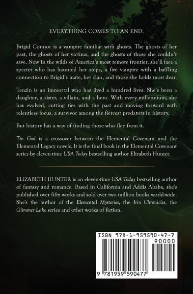 Everything comes to an end. Brigid Connor is a vampire familiar with ghosts. The ghosts of her past, the ghosts of her victims, and the ghosts of those she couldn't save. Now in the wilds of America's most remote frontier, she'll face a specter who has haunted her steps, a fire vampire with a baffling connection to Brigid's mate, her clan, and those she holds most dear. Tenzin is an immortal who has lived a hundred lives. She's been a daughter, a sister, a villain, and a hero. With every millennium, she has evolved, cutting ties with the past and moving forward with relentless focus, a survivor among the fiercest predators in history. But history has a way of finding those who flee from it. Tin God is a crossover between the Elemental Covenant and the Elemental Legacy novels. It is the final book in the Elemental Covenant series by eleven-time USA Today bestselling author Elizabeth Hunter.