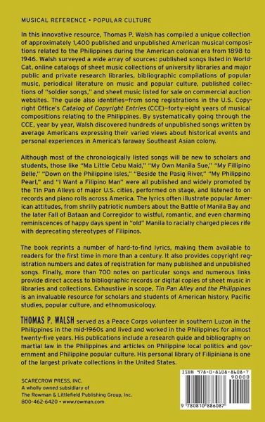 In this innovative resource, Thomas P. Walsh has compiled a unique collection of some 1,400 published and unpublished American musical compositions related to the Philippines during the American colonial era from 1898 to 1946. The book reprints a number of hard-to-find song lyrics, making them available to readers for the first time in more than a century. It also provides copyright registration numbers and dates of registration for many published and unpublished songs. Finally, more than 700 notes on particular songs and numerous links provide direct access to bibliographic records or digital copies of sheet music in libraries and collections.