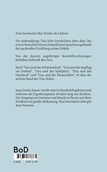 Eine Geschichte für Kinder ab 5 Jahren.Die siebenjährige Tina liebt Geschichten über alles. Bei einem Besuch bei ihrem Freund Hansi lauscht sie gefesselt der packenden Erzählung seines Onkels.Von der Autorin angefertigte Buntstiftzeichnungen bebildern liebevoll den Text.Nach "Tina und das Schwimmbad", "Tina und der Ausflug ins Freibad", "Tina und der Spielplatz", "Tina und das Geschenk" und "Tina und die Klassenfahrt" ist dies der sechste Band der Tina-Reihe.Anja Ursula Kayser wurde 1963 in Osnabrück geboren und arbeitete als Ergotherapeutin 28 Jahre lang mit Kindern. Der Umgang mit Literatur und Musik ist für sie seit ihrer Kindheit von großer Bedeutung. Ihre besondere Liebe gilt dem Vorlesen.