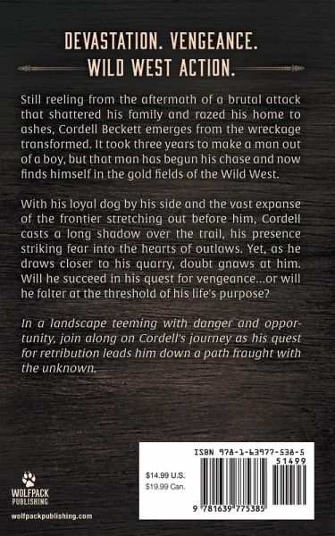 DEVASTATION. VENGEANCE. WILD WEST ACTION. Still reeling from the aftermath of a brutal attack that shattered his family and razed his home to ashes, Cordell Beckett emerges from the wreckage transformed. It took three years to make a man out of a boy, but that man has begun his chase and now finds himself in the gold fields of the Wild West. With his loyal dog by his side and the vast expanse of the frontier stretching out before him, Cordell casts a long shadow over the trail, his presence striking fear into the hearts of outlaws. Yet, as he draws closer to his quarry, doubt gnaws at him. Will he succeed in his quest for vengeance...or will he falter at the threshold of his life's purpose? In a landscape teeming with danger and opportunity, join along on Cordell's journey as his quest for retribution leads him down a path fraught with the unknown.