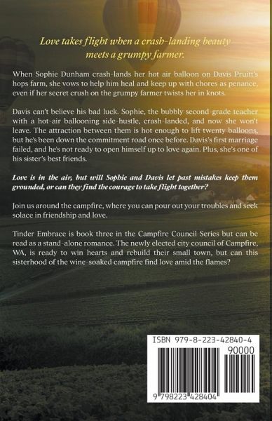 Love takes flight when a crash-landing beauty meets a grumpy farmer. When Sophie Dunham crash-lands her hot air balloon on Davis Pruitt's hops farm, she vows to help him heal and keep up with chores as penance, even if her secret crush on the grumpy farmer twists her in knots. Davis can't believe his bad luck. Sophie, the bubbly second-grade teacher with a hot-air ballooning side-hustle, crash-landed, and now she won't leave. The attraction between them is hot enough to lift twenty balloons, but he's been down the commitment road once before. Davis's first marriage failed, and he's not ready to open himself up to love again. Plus, she's one of his sister's best friends. Love is in the air, but will Sophie and Davis let past mistakes keep them grounded, or can they find the courage to take flight together? Join us around the campfire, where you can pour out your troubles and seek solace in friendship and love. Tinder Embrace is book three in the Campfire Council Series but can be read as a stand-alone romance. The newly elected city council of Campfire, WA, is ready to win hearts and rebuild their small town, but can this sisterhood of the wine-soaked campfire find love amid the flames?