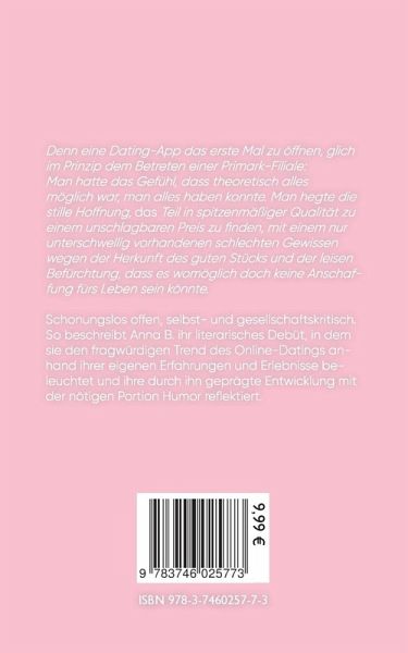 Denn eine Dating-App das erste Mal zu öffnen, glich im Prinzip dem Betreten einer Primark-Filiale: Man hatte das Gefühl, dass theoretisch alles möglich war, man alles haben konnte. Man hegte die stille Hoffnung, DAS Teil in spitzenmäßiger Qualität zu einem unschlagbaren Preis zu finden, mit einem nur unterschwellig vorhandenen schlechten Gewissen wegen der Herkunft des guten Stücks und der leisen Befürchtung, dass es womöglich doch keine Anschaffung fürs Leben sein könnte.Schonungslos offen, selbst- und gesellschaftskritisch. So beschreibt Anna B. ihr literarisches Debüt, in dem sie den fragwürdigen Trend des Online-Datings anhand ihrer eigenen Erfahrungen und Erlebnisse beleuchtet und ihre durch ihn geprägte Entwicklung mit der nötigen Portion Humor reflektiert.