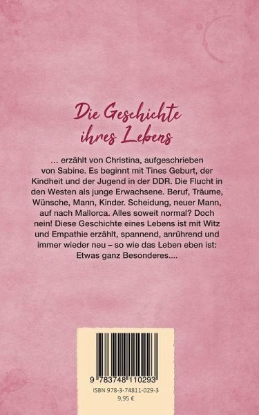 Die Geschichte ihres Lebens ...... erzählt von Christina, aufgeschrieben von Sabine. Es beginnt mit Tines Geburt, der Kindheit und der Jugend in der DDR. Die Flucht in den Westen als junge Erwachsene. Beruf, Träume, Wünsche, Mann, Kinder. Scheidung, neuer Mann, auf nach Mallorca. Alles soweit normal? Doch nein! Diese Geschichte eines Lebens ist mit Witz und Empathie erzählt, mal spannend wie ein Krimi, mal anrührend wie eine Liebesgeschichte und immer wieder neu. So wie das Leben eben ist: etwas ganz Besonderes!