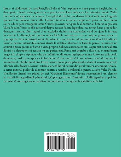 Într-o zi c¿lduroas¿ de var¿,Rexy,Tala,Zuko ¿i Vira explorau o nou¿ parte a junglei,când au descoperit o hart¿ veche gravat¿ pe o piatr¿ mare.Harta indica un loc misterios numit "Valea Focului Viu",despre care se spunea c¿ era plin¿ de fl¿c¿ri care dansau f¿r¿ s¿ ard¿ nimic.Legenda spunea c¿ în mijlocul v¿ii se afla "Flac¿ra Etern¿",o surs¿ de energie care putea s¿ ofere putere sau s¿ aduc¿ pace întregului t¿râm.Curio¿i ¿i aventurieri,puii de dinozaur au hot¿rât s¿ g¿seasc¿ Valea Focului Viu ¿i s¿ afle adev¿rul despre aceast¿ flac¿r¿ legendar¿. Au urmat harta prin p¿duri dense,au traversat râuri repezi ¿i au escaladat dealuri stâncoase,pân¿ când au ajuns la intrarea în vale.De la distan¿¿,puii puteau vedea fl¿c¿rile misterioase care se mi¿cau printre stânci ¿i vegetäie,dar f¿r¿ s¿ distrug¿ nimic.Pe m¿sur¿ ce au p¿¿it în vale,au sim¿it o c¿ldur¿ blând¿,de¿i focurile p¿reau intense.Tala,mereu atent¿ la detalii,a observat c¿ fl¿c¿rile p¿reau s¿ urmeze un anumit tipar,ca ¿i cum ar fi avut o viä¿ proprie.Zuko,cu curiozitatea lui,s-a apropiat de una dintre fl¿c¿ri ¿i a descoperit c¿ aceasta nu era periculoas¿.P¿rea mai degrab¿ o iluzie sau o manifestare magic¿.În timp ce explorau valea,au întâlnit un dinozaur în¿elept,pe nume Arko,care tr¿ia acolo de generäii.Arko le-a explicat c¿ Flac¿ra Etern¿ din centrul v¿ii nu era doar o surs¿ de putere,ci ¿i un simbol al echilibrului dintre for¿ele naturii:focul ¿i apa,p¿mântul ¿i vântul.Cu toate acestea,în ultimele zile, flac¿ra devenise instabil¿,iar echilibrul naturii din jurul v¿ii era amenin¿at.Arko le-a cerut ajutorul puilor de dinozaur pentru a restabili echilibrul ¿i pentru a salva Valea Focului Viu.Flac¿ra Etern¿ era p¿zit¿ de trei "Gardieni Elementari",fiecare reprezentând un element al naturii:Terra,gardianul p¿mântului,Zephyr,gardianul vântului,¿i Undina,gardiana apei.Puii trebuiau s¿ conving¿ fiecare gardian s¿ contribuie cu energia sa la stabilizarea fl¿c¿rii.
