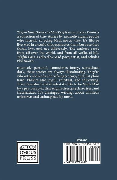Tinfoil Hats: Stories by Mad People in an Insane World is a collection of stories by neurodivergent people who identify as being Mad, about what it's like to live Mad in a world that oppresses them for the ways they think, live, and act differently from those who consider themselves Normal. intensely personal, sometimes funny, sometimes dark, these stories are always illuminating. some describe situations that are vibrantly shameful, horrifyingly scary, and just plain hard. they're also joyful, spiritual, and enlivening. these are narratives that describe in detail what it looks, feels, sounds, and smells like to be Made Mad. they outline what it's like for Mad people to interact with those in the psy-complex who stigmatize, psychiatrize, and traumatize those called crazy. it's unhinged writing, about whirleds unknown and unimagined by most. it's work that is immensely difficult to write, read, talk, or think about. Tinfoil Hats was not conceived as - should not be read as - some kind of trauma porn, a way to get juiced on the misery and distress of others. nope. nuttin like dat. instead, it sees Madness as a kind of political and revolutionary knowledge. it troubles the ways in which Mad bodyminds are heard and understood by the psy-industrial complex and the dominating, epistemic violence it inflicts on us all. the authors come from all over the world, and from all walks of life. Tinfoil Hats is edited by Mad poet, artist, and scholar Phil Smith, whose recent work Writhing Writing: Moving Towards a Mad Poetics (and published by Autonomous Press) won the 2020 American Educational Studies Association Critics Choice Award. this book is for you if you're a Mad person, or if you know someone who is. this book is for you if you're a social worker, psychologist, researcher, therapist, doctor, or nurse, and want to know what it's like to live Mad. this book is for you if you're curious about what saneism is, and what that form of oppression means in the lives of real people. Tinfoil Hats is the beginning of a Mad (r)evolution. join us.