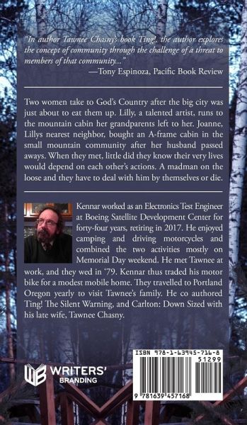 Synopsis:Two women take to God's Country after the big city was just about to eat them up. Lilly, a talented artist, runs to the mountain cabin her grandparents left to her. Joanne, Lillys nearest neighbor, bought an A-frame cabin in the small mountain community after her husband passed away. When they met, little did they know their very lives would depend on each other's actions. A madman on the loose and they have to deal with him by themselves or die. Autobiography: Kennar worked as an Electronics Test Engineer at Boeing Satellite Development Center for forty-four years, retiring in 2017. He enjoyed camping and driving motorcycles and combined the two activities mostly on Memorial Day weekend. He met Tawnee at work, and they wed in '79. Kennar thus traded his motor bike for a modest mobile home. They travelled to Portland Oregon yearly to visit Tawnee's family. He co authored Ting! The Silent Warning, and Carlton: Down Sized with his late wife, Tawnee Chasny.