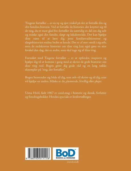 "Tingene fortæller ..." er en ny og sjov vinkel på det at fortælle din og din families historie. Ved at fortælle de historier, der knytter sig til de ting, du er mest glad for, fortæller du samtidig en del om dig selv og måske også din familie, slægt og lokalområde. Det kan hjælpe dine nære til at lære dig, jeres familietraditionerne og slægtshistorien endnu bedre at kende. Det er af stor værdi i sig selv, men de nedskrevne historier om dine ting kan også gøre en stor forskel den dag, det er andre, som skal tage sig af dine ting. Formålet med "Tingene fortæller ..." er at opfordre, inspirere og hjælpe dig til at komme i gang med at skrive de gode historier om dine ting ned. Bogen giver dig gode råd og en lang række eksempler på "ting, der fortæller". Bogen henvender sig både til dig, som selv vil skrive og til dig, som vil hjælpe en anden. Måske er du pårørende, frivillig eller plejer.