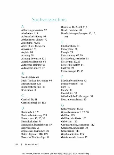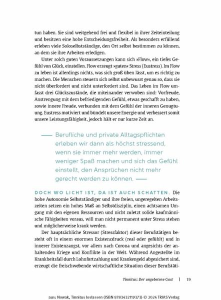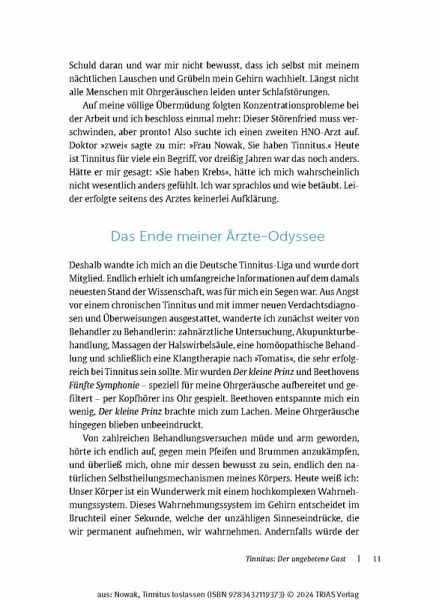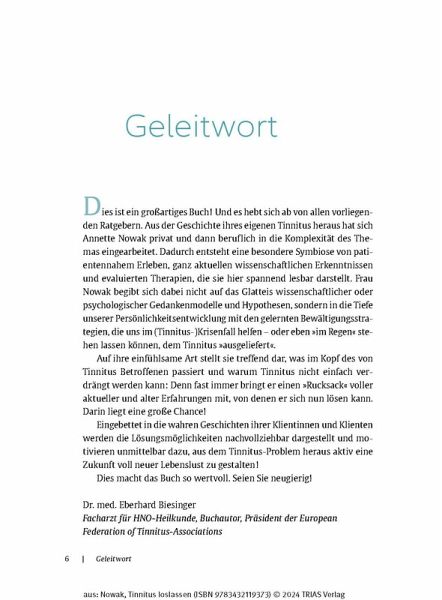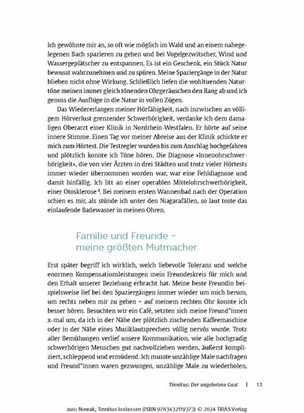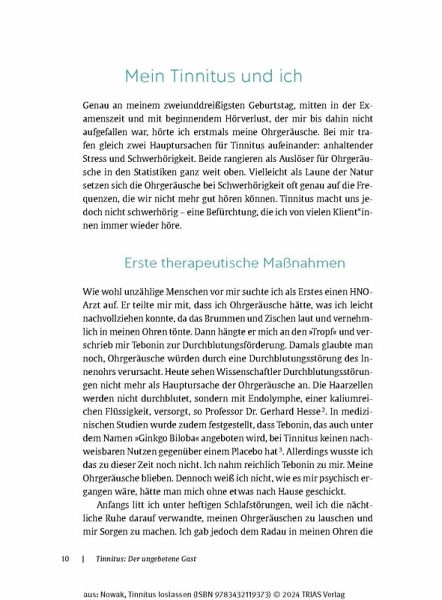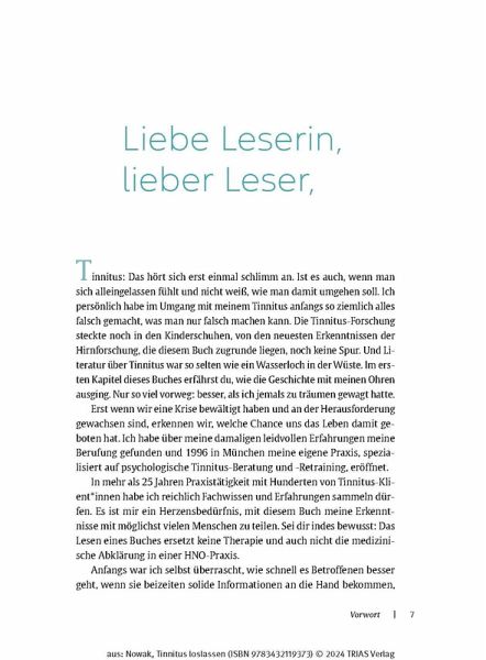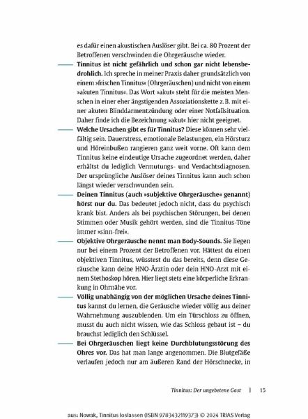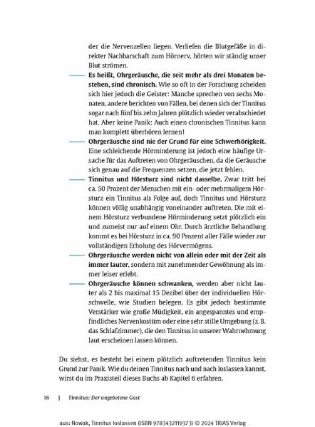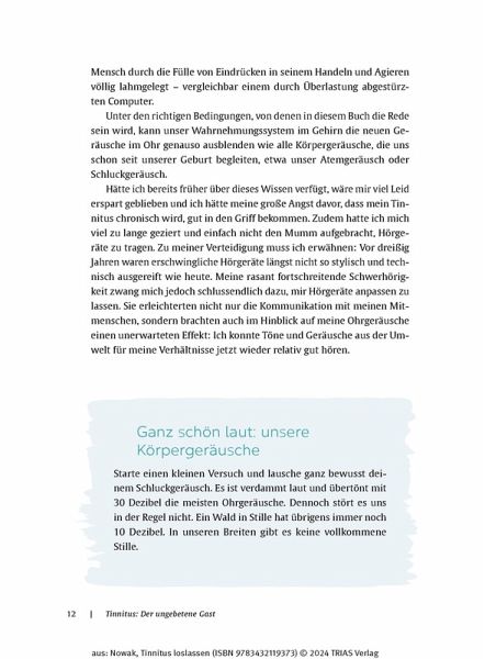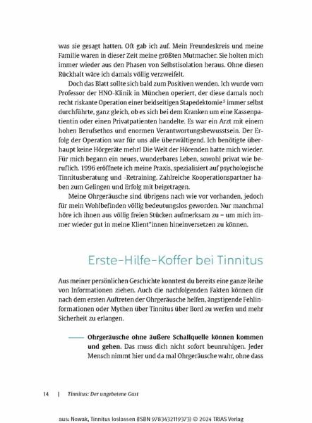 Stress, ein Hörsturz, emotionale Belastungen, Schwerhörigkeit oder häufige Mittelohrentzündungen sind meist die Auslöser von Tinnitus. "Geht das denn nie wieder weg?" ist die bange Frage vieler Betroffener. Aus der Neurowissenschaft weiß man heute, dass die Geräusche nicht im Ohr selbst, sondern im Gehirn entstehen. Nur wenn dieses Organ in die Therapie einbezogen wird, ist eine Linderung möglich. Die selbst betroffene Autorin ist in ihrer Praxis seit vielen Jahren auf die psychologische Beratung von Tinnitus-Betroffenen sowie auf die Tinnitusbewältigung spezialisiert. In diesem Ratgeber bringt sie die bahnbrechenden Erkenntnisse der Hirnforschung verständlich auf den Punkt und zeigt, wie Sie diese ganz praktisch in Ihren Alltag integrieren.