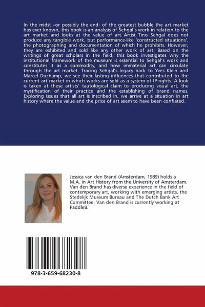 In the midst -or possibly the end- of the greatest bubble the art market has ever known, this book is an analysis of Sehgal's work in relation to the art market and looks at the value of art. Artist Tino Sehgal does not produce any tangible work, but performance-like 'constructed situations', the photographing and documentation of which he prohibits. However, they are exhibited and sold like any other work of art. Based on the writings of great scholars in the field, this book investigates why the institutional framework of the museum is essential to Sehgal's work and constitutes it as a commodity, and how immaterial art can circulate through the art market. Tracing Sehgal's legacy back to Yves Klein and Marcel Duchamp, we see their lasting influences that contributed to the current art market in which works are sold as a system of IP-rights. A look is taken at these artists' tautological claim to producing visual art, the mystification of their practice and the establishing of brand names. Exploring issues that all art is inscribed in, we arrive at a situation in art history where the value and the price of art seem to have been conflated.