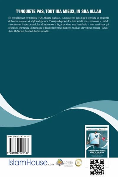 T'INQUIETE PAS, TOUT IRA MIEUX, IN SHA ALLAH En consultant cet écrit intitulé Qu'Allah te guérisse... , nous avons trouvé qu'il regroupe un ensemble de bonnes manières, de règles religieuses, d'avis juridiques et d'histoires réelles qui concernent le malade - notamment l'aspect moral, les adorations ou la façon de vivre avec la maladie - mais aussi ceux qui souhaitent leur rendre visite puisqu'il détaille les bonnes manières relatives à la visite du malade - Abdul-Azîz Ali-Sheikh, Mufti d'Arabie Saoudite. DON'T WORRY, EVERYTHING WILL BE BETTER, IN SHA ALLAH By consulting this writing entitled "May Allah heal you...", we found that it brings together a collection of good manners, religious rules, legal opinions and real stories which relate to the patient - in particular the moral aspect, adorations or the way of living with the disease - but also those who wish to visit them since it details the good manners relating to the visit of the sick - Abdul-Azîz Ali-Sheikh, Mufti of Saudi Arabia.