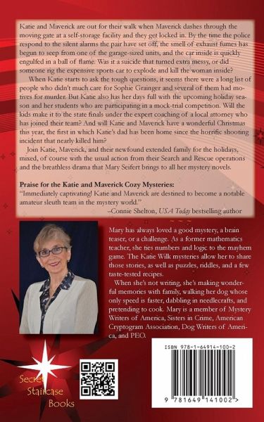 Katie and Maverick are out for their walk when Maverick dashes through the moving gate at a self-storage facility and they get locked in. By the time the police respond to the silent alarms the pair have set off, the smell of exhaust fumes has begun to seep from one of the garage-sized units, and the car inside is quickly engulfed in a ball of flame. Was it a suicide that turned extra messy, or did someone rig the expensive sports car to explode and kill the woman inside? When Katie starts to ask the tough questions, it seems there were a long list of people who didn't much care for Sophie Grainger and several of them had motives for murder. But Katie also has her days full with the upcoming holiday season and her students who are participating in a mock-trial competition. Will the kids make it to the state finals under the expert coaching of a local attorney who has joined their team? And will Katie and Maverick have a wonderful Christmas this year, the first in which Katie's dad has been home since the horrific shooting incident that nearly killed him? Join Katie, Maverick, and their newfound extended family for the holidays, mixed, of course with the usual action from their Search and Rescue operations and the breathless drama that Mary Seifert brings to all her mystery novels. Praise for the Katie and Maverick Cozy Mysteries: "Immediately captivating! Katie and Maverick are destined to become a notable amateur sleuth team in the mystery world." -Connie Shelton, USA Today bestselling author "I thoroughly enjoyed this debut book by Mary Seifert! This well written and thoughtful story kept me engaged with fun characters, interesting information and mind and math puzzles. Looking forward to book two!" James, Amazon 5-star review "Fun read! The author has an authentic voice and has done her research. The plot covers many topics: dogs, history, the inner workings of hospitals, family dynamics, and more. I especially enjoyed the puzzles and little-known historical facts that were part of the story. Maverick, Movies & Murder kept my interest and left me wanting more. Highly recommend!" Beth, Amazon 5-star review