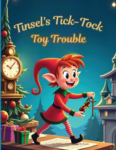 Target Audience Children aged 4-8, encouraging themes of family unity and community togetherness. Plot Summary **Tinsel:** Tinsel is a young, energetic elf with bright green eyes that sparkle with enthusiasm. He has a cheerful, round face, rosy cheeks, and a pointed nose. His bright red hair is always slightly messy, sticking out from under his oversized green elf hat. Tinsel wears a bright green tunic, striped red and white stockings, and pointy-toed shoes with bells on the ends that jingle with every step. He always carries a small notebook and a pencil tucked behind his ear. **Jingle:** Jingle is a wise, older elf, with a long white beard that reaches his belly and kind, crinkled blue eyes. He has a slightly hunched back from years of working at his workbench. Jingle wears spectacles perched on the end of his nose and a traditional blue elf outfit, complete with a tall, pointed hat. He has a gentle smile and a calm, reassuring demeanor.