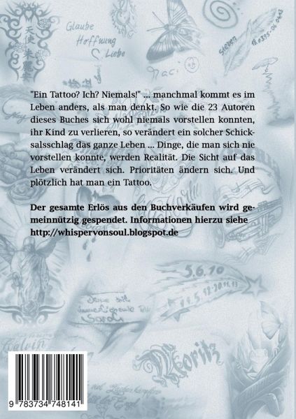 "Ein Tattoo? Ich? Niemals!" ... manchmal kommt es im Leben anders, als man denkt. So wie die 23 Autoren dieses Buches sich wohl niemals vorstellen konnten, ihr Kind zu verlieren, so verändert ein solcher Schicksalsschlag das ganze Leben ... Dinge, die man sich nie vorstellen konnte, werden Realität. Die Sicht auf das Leben verändert sich. Prioritäten ändern sich. Und plötzlich hat man ein Tattoo.Der gesamte Erlös aus den Buchverkäufen wird gemeinnützig gespendet. Informationen hierzu siehe http://whispervonsoul.blogspot.de