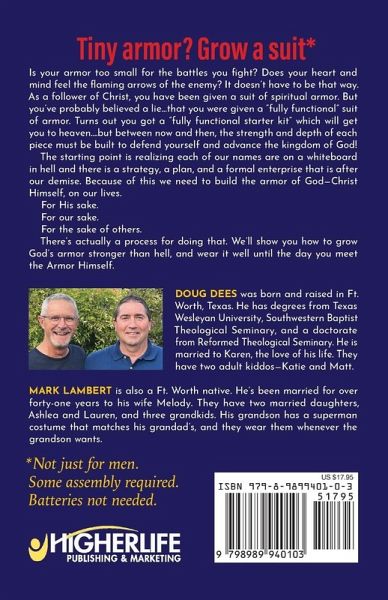 Tiny armor? Grow a suit*Is your armor too small for the battles you fight? Does your heart and mind feel the flaming arrows of the enemy? It doesn't have to be that way. As a follower of Christ, you have been given a suit of spiritual armor. But you've probably believed a lie...that you were given a "fully functional" suit of armor. Turns out you got a "fully functional starter kit" which will get you to heaven....but between now and then, the strength and depth of each piece must be built to defend yourself and advance the kingdom of God!The starting point is realizing each of our names are on a whiteboard in hell and there is a strategy, a plan, and a formal enterprise that is after our demise. Because of this we need to build the armor of God-Christ Himself, on our lives.For His sake.For our sake.For the sake of others.There's actually a process for doing that. We'll show you how to grow God's armor stronger than hell, and wear it well until the day you meet the Armor Himself. *Not just for men.Some assembly required.Batteries not needed.