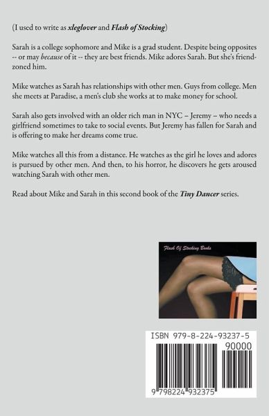 (I used to write as xleglover and Flash of Stocking) Sarah is a college sophomore and Mike is a grad student. Despite being opposites -- or may because of it -- they are best friends. Mike adores Sarah. But she's friend-zoned him. Mike watches as Sarah has relationships with other men. Guys from college. Men she meets at Paradise, a men's club she works at to make money for school. Sarah also gets involved with an older rich man in NYC - Jeremy - who needs a girlfriend sometimes to take to social events. But Jeremy has fallen for Sarah and is offering to make her dreams come true. Mike watches all this from a distance. He watches as the girl he loves and adores is pursued by other men. And then, to his horror, he discovers he gets aroused watching Sarah with other men. Read about Mike and Sarah in this second book of the Tiny Dancer series.