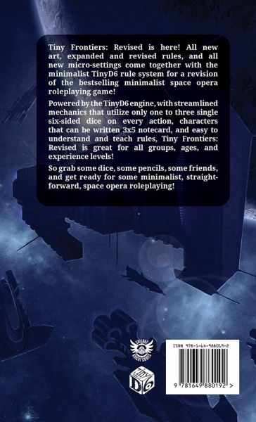 Tiny Frontiers: Revised is here! All new art, expanded and revised rules, and all new micro-settings come together with the minimalist TinyD6 rule system for a revision of the bestselling minimalist space opera roleplaying game! Powered by the TinyD6 engine, with streamlined mechanics that utilize only one to three single six-sided dice on every action, characters that can be written 3x5 notecard, and easy to understand and teach rules, Tiny Frontiers: Revised is great for all groups, ages, and experience levels! Featuring exciting micro-settings designed to jump start your imagination and campaign, writty by some of the most talented writers out there, Tiny Frontiers; Revised will provide an easy launching pad for conventions, one-offs or short campaigns! Designed to emulate classic space opera, and providing an open framework for exciting stories, Tiny Frontiers: Revised is here! Completely compatible with the other TinyD6 games, Tiny Frontiers: Revised is a fully-stand alone game. So grab some dice, some pencils, some friends, and get ready for some minimalist, straight-forward, space opera roleplaying!