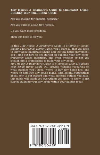Tiny House: A Beginner's Guide to Minimalist Living. Building Your Small Home Guide Are you looking for financial security? Are you curious about tiny homes? Do you want more freedom? Then this book is for you! In this Tiny House: A Beginner's Guide to Minimalist Living, Building Your Small Home Guide, you'll learn all that you need to know about minimalist living and the tiny house movement. You'll find out how to get started on building your tiny home, frequently asked questions, and even whether or not you should hire a professional to build your tiny home. Tiny House: A Beginner's Guide to Minimalist Living, Building Your Small Home Guide will provide valuable resources on what supplies you'll need, where to buy tiny home kits, and where to find free tiny house plans. With helpful suggestions about how to get started and what material options you have, this guide will teach you everything you need to know to get started building your tiny home within your budget today.