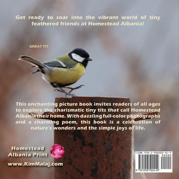 Get ready to soar into the vibrant world of tiny feathered friends at Homestead Albania! This enchanting picture book invites readers of all ages to explore the charismatic tiny tits that call Homestead Albania their home. With dazzling full-color photographs and a charming poem, this book is a celebration of nature's wonders and the simple joys of life. What makes this book a must-have: Stunning Photography - Immerse yourself in breathtaking snapshots of the tiny tits as they flutter through lush landscapes and showcase their brilliant plumage. Thoughtful Design - Each page is crafted to bring the tiny tits world to life, with elegant layouts that let the beauty of nature shine. A Universal Tale - Perfect for bird lovers, nature enthusiasts, or anyone looking for a peaceful escape into the wild. Whether you're seeking inspiration, a cozy read, or the perfect gift for a nature lover, Tiny Tits at Homestead Albania is a delightful addition to any collection. Fly into their world today and experience the magic of these tiny, yet extraordinary, birds!