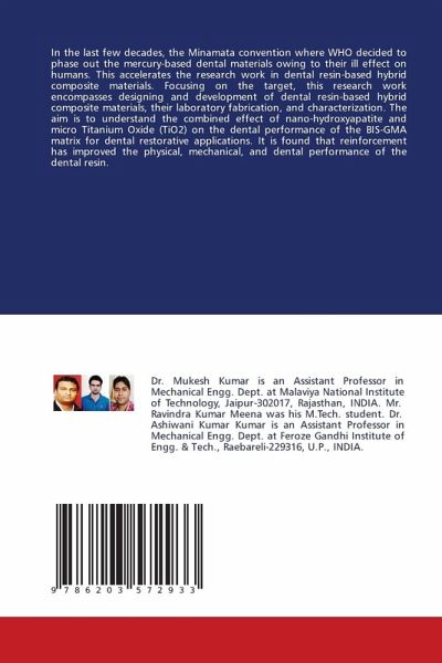 In the last few decades, the Minamata convention where WHO decided to phase out the mercury-based dental materials owing to their ill effect on humans. This accelerates the research work in dental resin-based hybrid composite materials. Focusing on the target, this research work encompasses designing and development of dental resin-based hybrid composite materials, their laboratory fabrication, and characterization. The aim is to understand the combined effect of nano-hydroxyapatite and micro Titanium Oxide (TiO2) on the dental performance of the BIS-GMA matrix for dental restorative applications. It is found that reinforcement has improved the physical, mechanical, and dental performance of the dental resin.