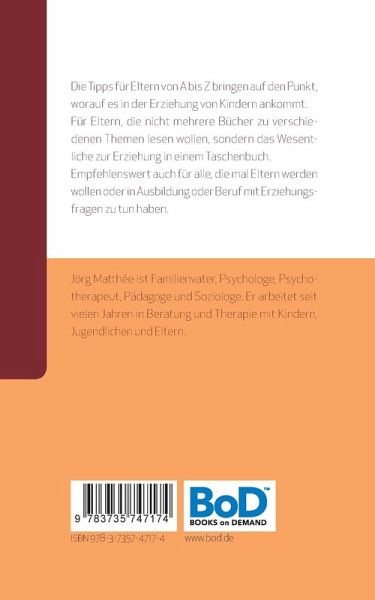Die Tipps für Eltern von A bis Z bringen auf den Punkt, worauf es in der Erziehung von Kindern ankommt.Für Eltern, die nicht mehrere Bücher zu verschiedenen Themen lesen wollen, sondern das Wesentliche zur Erziehung in einem Taschenbuch.Empfehlenswert auch für alle, die mal Eltern werden wollen oder in Ausbildung oder Beruf mit Erziehungsfragen zu tun haben.
