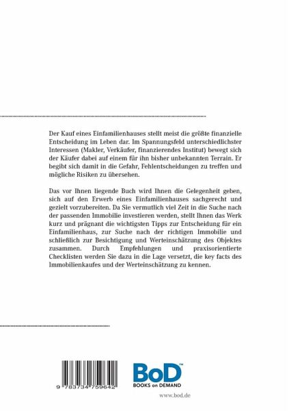 Der Kauf eines Einfamilienhauses stellt meist die größte finanzielle Entscheidung im Leben dar. Im Spannungsfeld unterschiedlichster Interessen (Makler, Verkäufer, finanzierendes Institut) bewegt sich der Käufer dabei auf einem für ihn bisher unbekannten Terrain. Er begibt sich damit in die Gefahr, Fehlentscheidungen zu treffen und mögliche Risiken zu übersehen. Das vor Ihnen liegende Buch wird Ihnen die Gelegenheit geben, sich auf den Erwerb eines Einfamilienhauses sachgerecht und gezielt vorzubereiten. Da Sie vermutlich viel Zeit in die Suche nach der passenden Immobilie investieren werden, stellt Ihnen das Werk kurz und prägnant die wichtigsten Tipps zur Entscheidung für ein Einfamilienhaus, zur Suche nach der richtigen Immobilie und schließlich zur Besichtigung und Werteinschätzung des Objektes zusammen. Durch Empfehlungen und praxisorientierte Checklisten werden Sie dazu in die Lage versetzt, die key facts des Immobilienkaufes und der Werteinschätzung zu kennen.