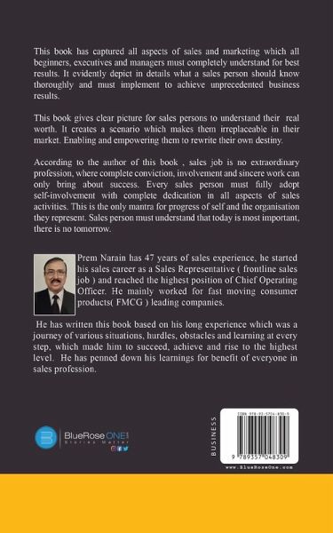 This book has captured all aspects of sales and marketing which all beginners, executives and managers must completely understand for best results. It evidently depict in details what a sales person should know thoroughly and must implement to achieve unprecedented business results. This book gives clear picture for sales persons to understand their real worth. It creates a scenario which makes them irreplaceable in their market. Enabling and empowering them to rewrite their own destiny. According to the author of this book, sales job is no extraordinary profession, where complete conviction, involvement and sincere work can only bring about success. Every sales person must fully adopt self-involvement with complete dedication in all aspects of sales activities. This is the only mantra for progress of self and the organisation they represent. Sales person must understand that today is most important, there is no tomorrow.