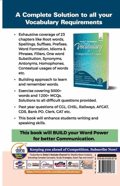 The book Tips & Techniques to Crack Vocabulary has been dedicated for aspirants who are preparing for General Competition Exams (Banking, SSC, Railways, Defence, Insurance, MBA, UPSC). The book contains different types of words that include Root words, Countable and Uncountable Nouns, words in singular and plural, words commonly Mispronounced, Misspelt, formation of words, Compound formation, Duplication, Conversion, Clippings, Acronyms, Comparisons, Antonyms, Synonyms, Homophones, Prefixes, Suffixes, etc. The main features of the books are: 1. To enhance and enrich your English vocabulary. 2. Understanding and learning as many words as possible; and also their usage in written and oral communication. 3. The book also focuses on Contextual Usage. 4. The book covers 5000+ Words with 1200+ Practice MCQs. 5. Covers Past Year MCQs of various SSC, Banmking, RAILWAYS, Defence & MBA Exams. The book will also be useful for Civil Services Main Exams in both UPSC & State PSC as a lot of questions are asked from English.