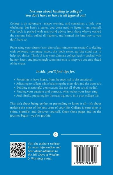 Nervous About College? You're Not Alone. You don't have to have it all figured out-no one does! College is a whirlwind-exciting, messy, and sometimes overwhelming. But here's the good news: you don't have to navigate it alone. This book is your go-to survival guide, packed with real-world wisdom from students who've been there, pulled all-nighters, tackled awkward roommate moments, and learned the hard way-so you don't have to. Inside, you'll find practical, bite-sized tips to help you thrive-not just survive-college life. Whether you're worried about classes, campus life, or just making new friends, this book has your back. What's Inside?Preparing to leave home-from packing smart to handling homesickness.¿ Adjusting to college life-balancing freedom, fun, and responsibilities.¿ Building meaningful connections-because friendships are more than just social media likes.¿ Finding your passions and purpose-whether in the classroom, clubs, or late-night pizza debates.¿ Setting yourself up for success beyond college-because the real world is closer than you think. This isn't about perfection-it's about making the most of every moment. College is your time to explore, grow, stumble, and shine. Open these pages, dive in, and get ready for the adventure ahead. You've got this!