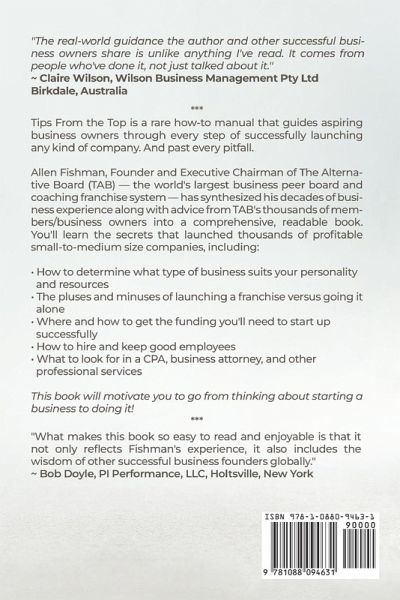 "The real-world guidance the author and other successful business owners share is unlike anything I've read. It comes from people who've done it, not just talked about it." Claire Wilson Wilson Business Management Pty Ltd Birkdale, Australia Tips From the Top is a rare how-to manual that guides aspiring business owners through every step of successfully launching any kind of company. And past every pitfall. Allen Fishman, Founder and Executive Chairman of The Alternative Board (TAB) - the world's largest business peer board and coaching franchise system - has synthesized his decades of business experience along with advice from TAB's thousands of members/business owners into a comprehensive, readable book. You'll learn the secrets that launched thousands of profitable small-to-medium size companies, including: · How to determine what type of business suits your personality and resources · The pluses and minuses of launching a franchise versus going it alone · Where and how to get the funding you'll need to start up successfully · How to hire and keep good employees · What to look for in a CPA, business attorney, and other professional services This book will motivate you to go from thinking about starting a business to doing it! "What makes this book so easy to read and enjoyable is that it not only reflects Fishman's experience, it also includes the wisdom of other successful business founders globally." Bob Doyle PI Performance, LLC Holtsville, New York Allen E. Fishman (in same color as used on front cover), is Founder and Executive Chairman of The Alternative Board ® (TAB), the world's largest franchise system providing advisory board and executive coaching services for business owners. Fishman has authored several books in which he shares his business insights to help business owners, including two best sellers: 7 Secrets of Great Entrepreneurial Masters Business Success: The GEM Power Formula for Lifelong Success and 9 Elements of Family Business Success: A Proven Formula for Improving Leadership & Relationships in Family Business. Fishman's business success and ability to communicate his business and economic advice has been recognized in media such as: The Wall Street Journal, USA Today, Business Week, Inc. Magazine, Fortune Small Business, The Los Angeles Times, The Chicago Tribute and The Denver Post. Fishman holds a finance degree, Magna Cum Laude, and a Juris Doctorate law degree from St. Louis University.