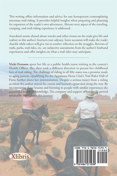 This writing offers information and advice for any horseperson contemplating interstate trail riding. It provides helpful insights when preparing and planning for expansion of the reader's own adventures. Almost every aspect of the traveling, camping, and trail-riding experience is addressed. Anecdotal stories shared about wrecks and other events on the trails give life and realism to this author's fourteen-year odyssey. Some accounts will make the reader chuckle while others will give rise to somber reflection on the struggles. Reviews of trails, parks, trail rides, etc. are subjective assessments from the author's firsthand experiences and offer insights on what a trail rider may anticipate.