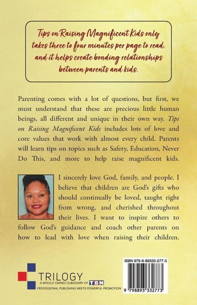 Parenting comes with a lot of questions, but first, we must understand that these are precious little human beings, all different and unique in their own way. Tips on Raising Magnificent Kids includes lots of love and core values that work with almost every child. Parents will learn tips on topics such as Safety, Education, Never Do This, and more to help raise magnificent kids.