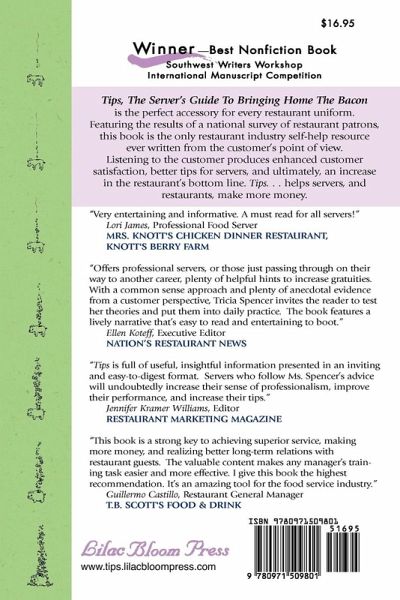 "Tips, The Server's Guide To Bringing Home The Bacon - The Customer Speaks!" is the perfect accessory for every restaurant uniform. Featuring the results of a national survey of restaurant patrons, this book is the only restaurant industry self-help resource written from the customer's point of view. Delightfully illustrated and straight-shooting, "Tips..." helps servers and restaurants make more money.
