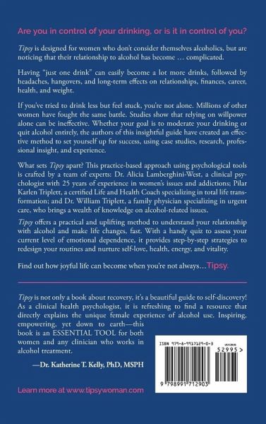 Are you in control of your drinking, or is it in control of you? Tipsy is designed for women who don't consider themselves alcoholics, but are noticing that their relationship to alcohol has become ... complicated. Having "just one drink" can easily become a lot more drinks, followed by headaches, hangovers, and long-term effects on relationships, finances, career, health, and weight. If you've tried to drink less but feel stuck, you're not alone. Millions of other women have fought the same battle. Studies show that relying on willpower alone can be ineffective. Whether your goal is to moderate your drinking or quit alcohol entirely, the authors of this insightful guide have created an effective method to set yourself up for success, using case studies, research, professional insight, and experience. What sets Tipsy apart? This practice-based approach using psychological tools is crafted by a team of experts: Dr. Alicia Lamberghini-West, a clinical psychologist with 25 years of experience in women's issues and addictions; Pilar Karlen Triplett, a certified Life and Health Coach specializing in total life transformation; and Dr. William Triplett, a family physician specializing in urgent care, who brings a wealth of knowledge on alcohol-related issues. Tipsy offers a practical and uplifting method to understand your relationship with alcohol and make life changes, fast. With a handy quiz to assess your current level of emotional dependence, it provides step-by-step strategies to redesign your routines and nurture self-love, health, energy, and vitality. Find out how joyful life can become when you're not always...Tipsy.