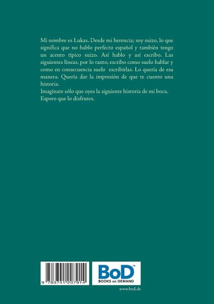 Mi nombre es Lukas. Desde mi herencia; soy suizo, lo que significa que no hablo perfecto español y también tengo un acento típico suizo. Así hablo y así escribo. Las siguientes líneas, por lo tanto, escribo como suelo hablar y como en consecuencia suelo escribirlas. Lo quería de esa manera. Quería dar la impresión de que te cuento una historia. Imagínate sólo que oyes la siguiente historia de mi boca. Espero que lo disfrutes.