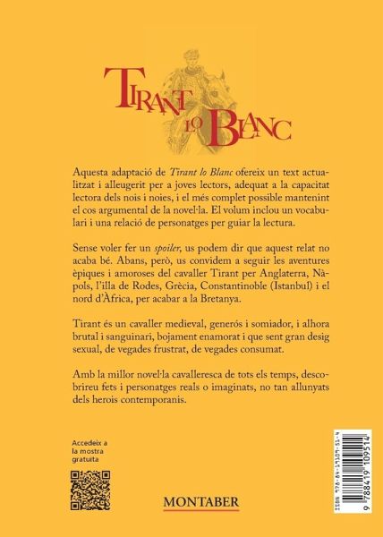 Aquesta adaptació de Tirant lo Blanc ofereix un text actualitzat i alleugerit per a joves lectors, adequat a la capacitat lectora dels nois i noies, i el més complet possible mantenint el cos argumental de la novel·la. El volum inclou més de 50 il·lustracions, un vocabulari i una relació de personatges per guiar la lectura. Sense voler fer un spoiler, us podem dir que aquest relat no acaba bé. Abans, però, us convidem a seguir les aventures èpiques i amoroses del cavaller Tirant per Anglaterra, Nàpols, l'illa de Rodes, Grècia, Constantinoble (Istanbul) i el nord d'Àfrica, per acabar a la Bretanya. Tirant és un cavaller medieval, generós i somiador, i alhora brutal i sanguinari, bojament enamorat i que sent gran desig sexual, de vegades frustrat, de vegades consumat. Amb la millor novel·la cavalleresca de tots els temps, descobrireu fets i personatges reals o imaginats, no tan allunyats dels herois contemporanis.