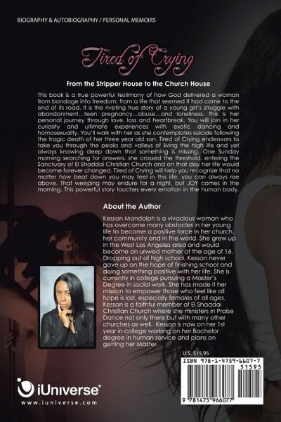 This book is a true powerful testimony of how God delivered a woman from bondage into freedom, from a life that seemed it had come to the end of its road. It is the riveting true story of a young girl's struggle with abandonment...teen pregnancy...abuse...and loneliness. This is her personal journey through love, loss and heartbreak. You will join in her curiosity and ultimate experiences with exotic dancing and homosexuality. You'll walk with her as she contemplates suicide following the tragic death of her three year old son. Tired of Crying endeavors to take you through the peaks and valleys of living the high life and yet always knowing deep down that something is missing. One Sunday morning searching for answers, she crossed the threshold, entering the Sanctuary of El Shaddai Christian Church and on that day her life would become forever changed. Tired of Crying will help you recognize that no matter how beat down you may feel in this life, you can always rise above. That weeping may endure for a night, but JOY comes in the morning. This powerful story touches every emotion in the human body.