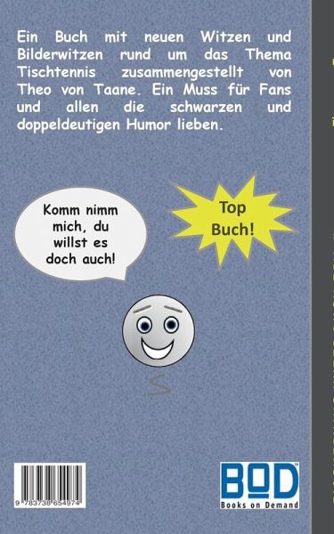 Ein Buch mit neuen Witzen und Bilderwitzen rund um das Thema Tischtennis zusammengestellt von Theo von Taane. Ein Muss für Fans und alle, die schwarzen und doppeldeutigen Humor lieben. Lustige Witze mit Unterschnitt!