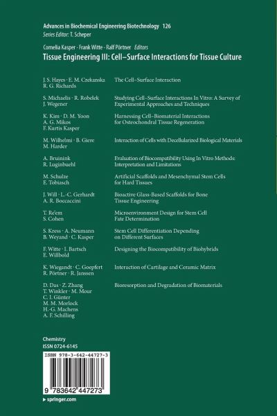 The Cell-Surface Interaction, by J. S. Hayes, E. M. Czekanska and R. G. Richards. Studying Cell-Surface Interactions In Vitro: A Survey of Experimental Approaches and Techniques, by Stefanie Michaelis, Rudolf Robelek and Joachim Wegener. Harnessing Cell-Biomaterial Interactions for Osteochondral Tissue Regeneration, by Kyobum Kim, Diana M. Yoon, Antonios G. Mikos and F. Kurtis Kasper. Interaction of Cells with Decellularized Biological Materials, by Mathias Wilhelmi, Bettina Giere and Michael Harder. Evaluation of Biocompatibility Using In Vitro Methods: Interpretation and Limitations, by Arie Bruinink and Reto Luginbuehl. Artificial Scaffolds and Mesenchymal Stem Cells for Hard Tissues, by Margit Schulze and Edda Tobiasch. Bioactive Glass-Based Scaffolds for Bone Tissue Engineering, by Julia Will, Lutz-Christian Gerhardt and Aldo R. Boccaccini. Microenvironment Design for Stem Cell Fate Determination, by Tali Re'em and Smadar Cohen. Stem Cell Differentiation Depending on Different Surfaces, by Sonja Kress, Anne Neumann, Birgit Weyand and Cornelia Kasper. Designing the Biocompatibility of Biohybrids, by Frank Witte, Ivonne Bartsch and Elmar Willbold. Interaction of Cartilage and Ceramic Matrix, by K. Wiegandt, C. Goepfert, R. Pörtner and R. Janssen. Bioresorption and Degradation of Biomaterials, by Debarun Das, Ziyang Zhang, Thomas Winkler, Meenakshi Mour, Christina I. Günter, Michael M. Morlock, Hans-Günther Machens and Arndt F. Schilling.