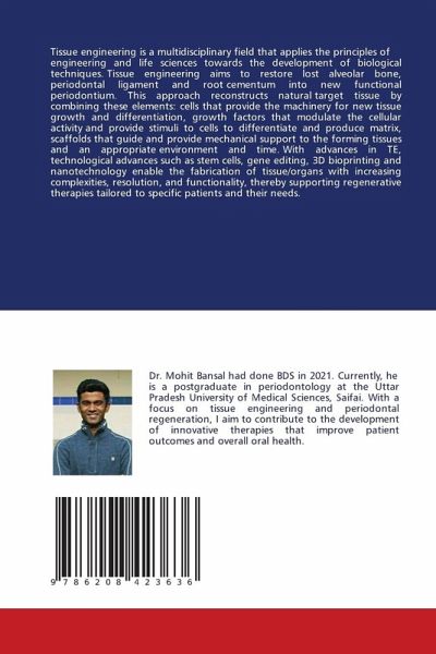 Tissue engineering is a multidisciplinary field that applies the principles of engineering and life sciences towards the development of biological techniques. Tissue engineering aims to restore lost alveolar bone, periodontal ligament and root cementum into new functional periodontium. This approach reconstructs natural target tissue by combining these elements: cells that provide the machinery for new tissue growth and differentiation, growth factors that modulate the cellular activity and provide stimuli to cells to differentiate and produce matrix, scaffolds that guide and provide mechanical support to the forming tissues and an appropriate environment and time. With advances in TE, technological advances such as stem cells, gene editing, 3D bioprinting and nanotechnology enable the fabrication of tissue/organs with increasing complexities, resolution, and functionality, thereby supporting regenerative therapies tailored to specific patients and their needs.