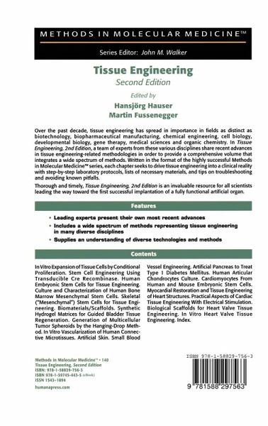 In Vitro Expansion of Tissue Cells by Conditional Proliferation.- Stem Cell Engineering Using Transducible Cre Recombinase.- Human Embryonic Stem Cells for Tissue Engineering.- Culture and Characterization of Human Bone Marrow Mesenchymal Stem Cells.- Skeletal ("Mesenchymal") Stem Cells for Tissue Engineering.- Biomaterials/Scaffolds.- Synthetic Hydrogel Matrices for Guided Bladder Tissue Regeneration.- Generation of Multicellular Tumor Spheroids by the Hanging-Drop Method.- In Vitro Vascularization of Human Connective Microtissues.- Artificial Skin.- Small Blood Vessel Engineering.- Artificial Pancreas to Treat Type 1 Diabetes Mellitus.- Human Articular Chondrocytes Culture.- Cardiomyocytes From Human and Mouse Embryonic Stem Cells.- Myocardial Restoration and Tissue Engineering of Heart Structures.- Practical Aspects of Cardiac Tissue Engineering With Electrical Stimulation.- Biological Scaffolds for Heart Valve Tissue Engineering.- In Vitro Heart Valve Tissue Engineering.