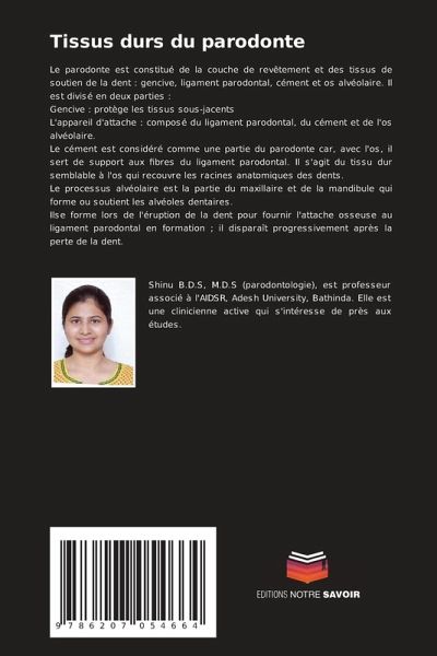 Le parodonte est constitué de la couche de revêtement et des tissus de soutien de la dent : gencive, ligament parodontal, cément et os alvéolaire. Il est divisé en deux parties : Gencive : protège les tissus sous-jacentsL'appareil d'attache : composé du ligament parodontal, du cément et de l'os alvéolaire.Le cément est considéré comme une partie du parodonte car, avec l'os, il sert de support aux fibres du ligament parodontal. Il s'agit du tissu dur semblable à l'os qui recouvre les racines anatomiques des dents.Le processus alvéolaire est la partie du maxillaire et de la mandibule qui forme ou soutient les alvéoles dentaires.Ilse forme lors de l'éruption de la dent pour fournir l'attache osseuse au ligament parodontal en formation ; il disparaît progressivement après la perte de la dent.