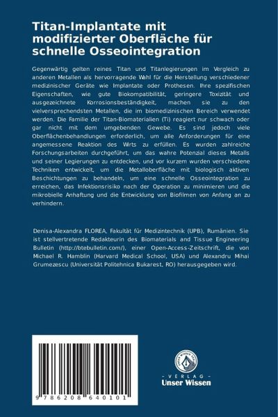 Gegenwärtig gelten reines Titan und Titanlegierungen im Vergleich zu anderen Metallen als hervorragende Wahl für die Herstellung verschiedener medizinischer Geräte wie Implantate oder Prothesen. Ihre spezifischen Eigenschaften, wie gute Biokompatibilität, geringere Toxizität und ausgezeichnete Korrosionsbeständigkeit, machen sie zu den vielversprechendsten Metallen, die im biomedizinischen Bereich verwendet werden. Die Familie der Titan-Biomaterialien (Ti) reagiert nur schwach oder gar nicht mit dem umgebenden Gewebe. Es sind jedoch viele Oberflächenbehandlungen erforderlich, um alle Anforderungen für eine angemessene Reaktion des Wirts zu erfüllen. Es wurden zahlreiche Forschungsarbeiten durchgeführt, um das wahre Potenzial dieses Metalls und seiner Legierungen zu entdecken, und vor kurzem wurden verschiedene Techniken entwickelt, um die Metalloberfläche mit biologisch aktiven Beschichtungen zu behandeln, um eine schnelle Osseointegration zu erreichen, das Infektionsrisiko nach der Operation zu minimieren und die mikrobielle Anhaftung und die Entwicklung von Biofilmen von Anfang an zu verhindern.