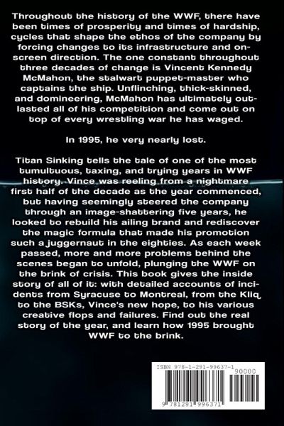 Throughout the history of the WWF, there have been times of prosperity and times of hardship, cycles that shape the ethos of the company by forcing changes to its infrastructure and on-screen direction. The one constant throughout three decades of change is Vincent Kennedy McMahon, the stalwart puppet-master who captains the ship. Unflinching, thick-skinned, and domineering, McMahon has ultimately outlasted all of his competition and come out on top of every wrestling war he has waged. In 1995, he very nearly lost. Titan Sinking tells the tale of one of the most tumultuous, taxing and trying years in WWF history. This book gives the inside story of all of it. Find out the real story of the year, and learn how 1995 brought WWF to the brink.