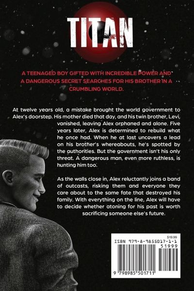 A teenaged boy gifted with incredible power and a dangerous secret searches for his brother in a crumbling world. At twelve years old, a mistake brought the world government to Alex's doorstep. His mother died that day, and his twin brother, Levi, vanished, leaving Alex orphaned and alone. Five years later, Alex is determined to rebuild what he once had. When he at last uncovers a lead on his brother's whereabouts, he's spotted by the authorities. But the government isn't his only threat. A dangerous man, even more ruthless, is hunting him too. As the walls close in, Alex reluctantly joins a band of outcasts, risking them and everyone they care about to the same fate that destroyed his family. With everything on the line, Alex will have to decide whether atoning for his past is worth sacrificing someone else's future.