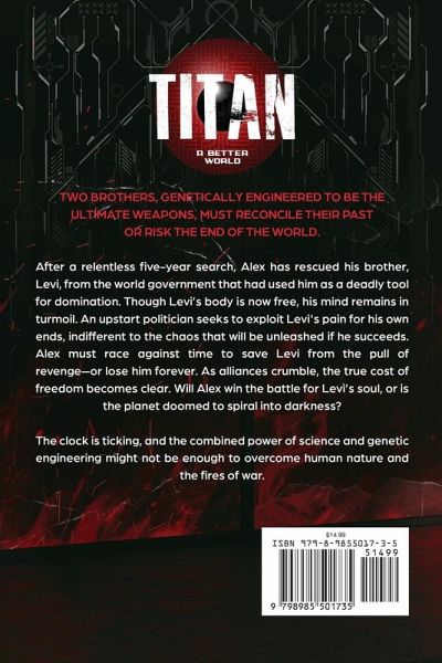 Two brothers, genetically engineered to be the ultimate weapons, must reconcile their past-or risk the end of the world. After a relentless five-year search, Alex has rescued his brother, Levi, from the world government that had used him as a deadly tool for domination. Though Levi's body is now free, his mind remains in turmoil. An upstart politician seeks to exploit Levi's pain for his own ends, indifferent to the chaos that will be unleashed if he succeeds. Alex must race against time to save Levi from the pull of revenge-or lose him forever. As alliances crumble, the true cost of freedom becomes clear. Will Alex win the battle for Levi's soul, or is the planet doomed to spiral into darkness? The clock is ticking, and the combined power of science and genetic engineering might not be enough to overcome human nature and the fires of war.
